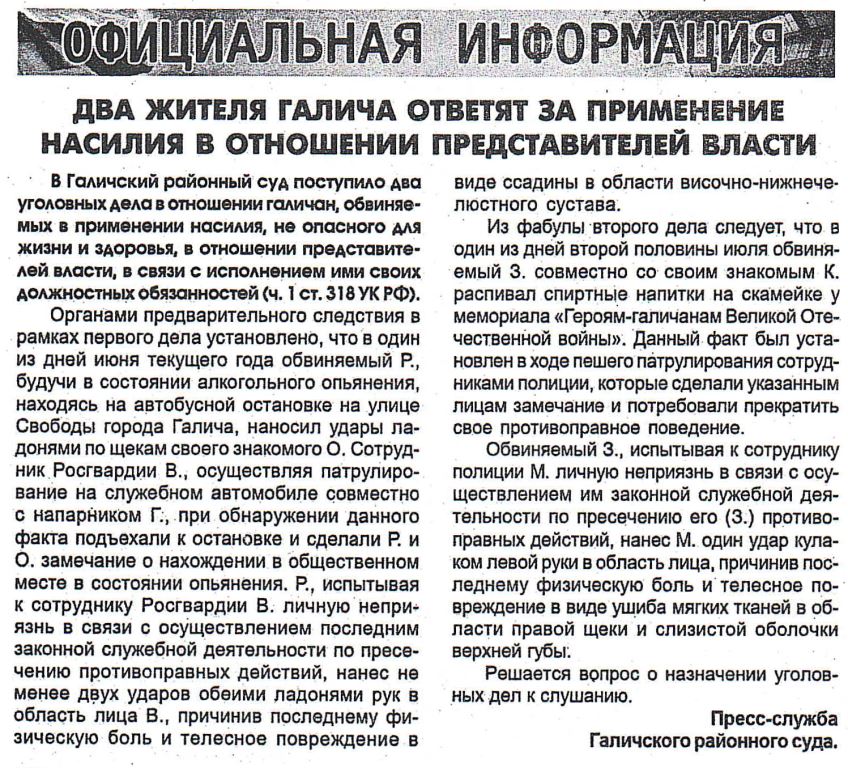 Два жителя Галича ответят за применение насилия в отношении представителей властиверсия для печати