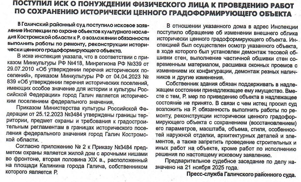 Поступил иск о понуждении физического лица к проведению работ по сохранению исторически ценного градоформирующего объектаверсия для печати