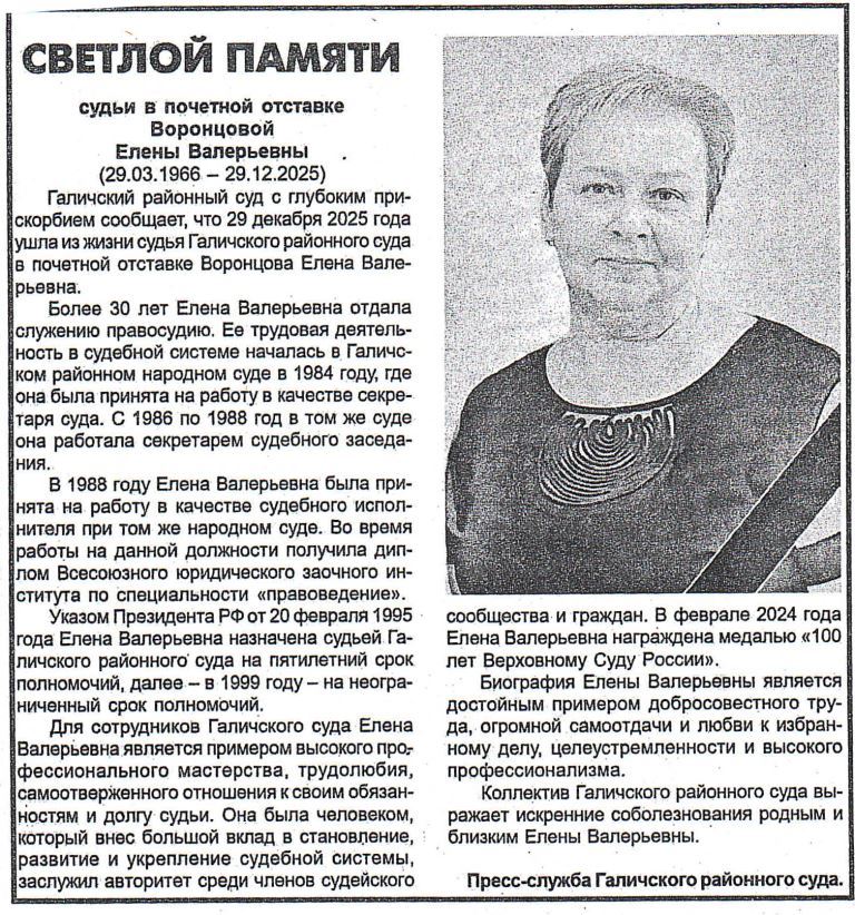 Светлой памяти судьи в почетной отставке Воронцовой Елены Валерьевныверсия для печати
