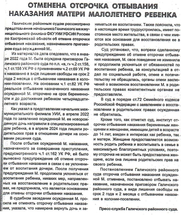 Отменена отсрочка отбывания наказания матери малолетнего ребёнкаверсия для печати