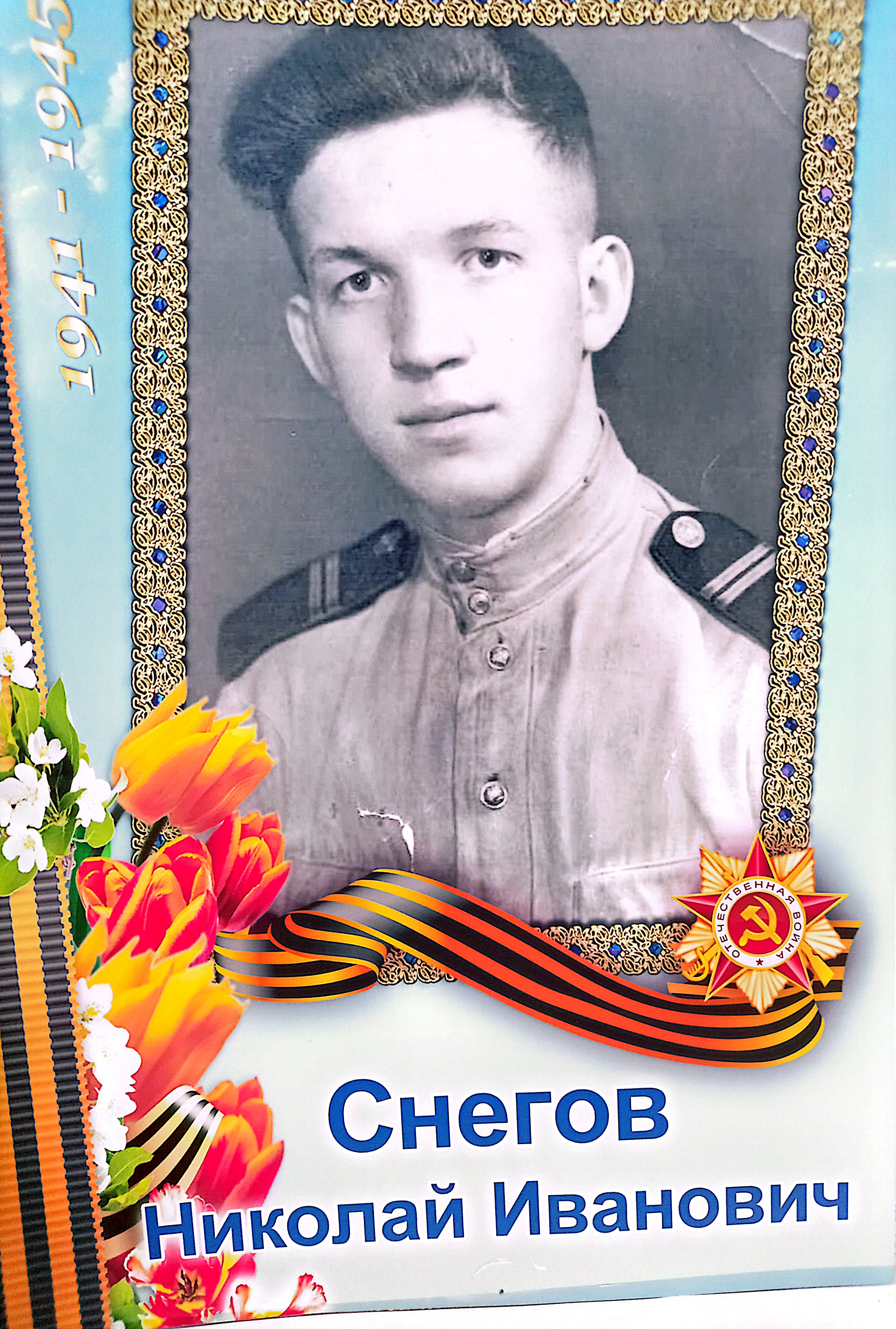 Родился Николай Иванович 10 декабря 1926 года в деревне Крусаново Галичского района. Был младшим ребенком в семье из пятерых детей. Еще в 16 лет он пришел в военкомат с требованием немедленно отправить его на фронт, но военком в ответ закричал, что на фронт требуются грамотные бойцы и отправил учиться. В декабре 1944 года Снегов Н.И. был призван в РККА Галичским РВК Ярославской области. Служил в 318 истребительно-противотанковом ордена Александра Невского артиллерийском полку 33 Черкасской истребительно-противотанковой ордена Александра невского артиллерийской бригаде в звании рядовой. Всего несколько километров не дошел он до Берлина. В апреле 1945 года в возрасте 18 лет получил осколочное ранение в шейный позвонок и был госпитализирован и перенаправлен в город Цхалтуб Грузинской ССР. Согласно приказа от 21 мая 1945 года за №8/н действующей армии от имени Президиума Верховного совета Союза Советских Социалистических Республик за образцовое выполнение боевых заданий командования на фронте борьбы с немецкими захватчиками и проявленные при этом доблесть и мужество награжден медалью «За боевые заслуги» за то, что «в бою при форсировании реки Шпрее – Германия 23 апреля 1945 года он под сильным огнем противника в составе расчета уничтожил две пулеметные точки и пять гитлеровцев». 21 июля 1947 года Николай Иванович был уволен в запас.