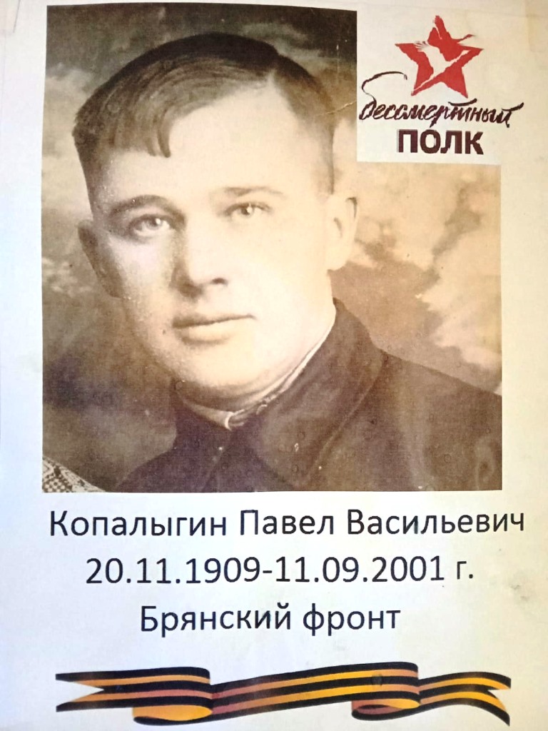 Копалыгин Павел Васильевич родился 20 ноября 1909 года в д. Филино Антроповского района Костромской области. В декабре 1942 года Павел Васильевич был призван на фронт, воевал в составе Брянского фронта, являлся стрелком из противотанкового ружья весом 21 кг. 28 августа 1943 года в ходе сражения под Прохоровкой знаменитой Курской битвы подбил вражеский танк и был тяжело ранен осколком мины, после чего отправлен в госпиталь, а затем комиссован. За этот подвиг Копалыгин П.В. был представлен к награде – медаль «За отвагу», которая была вручена ему лишь в 1970 году. Павел Васильевич был отцом семерых детей, после войны продолжил трудовую деятельность и работал охранником банка в п. Антропово. Всю свою жизнь он прожил с осколком в груди, в миллиметре от сердца. Несмотря на тяжелое ранение Копалыгин П.В. прожил до 91 года, умер 11 сентября 2001 года.